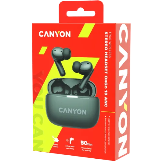 Have you already tried true wireless earphones? There is a chance you won’t look back with Canyon OnGo 10 earbuds. With the energy-efficient Bluetooth 5.3, they offer long playtime and stable connection to your device even if you’re not close. Perfect for music and calls thanks to four microphones: active noise canceling ensures you hear what you want to hear. Besides, it is activated automatically in-call. OnGo 10 earbuds are controlled by touch and have a voice assistant to inform you about the status of your earphones. The case supports Quick Charge technology. You can get a full charge for your earphones in just 50 minutes. Elegant and ergonomic, these TWS earphones do look great in any color: black, deep blue, or beige. We added earcaps in three sizes to make the fit ideal for you. Pick one today and bring joy to your ears!